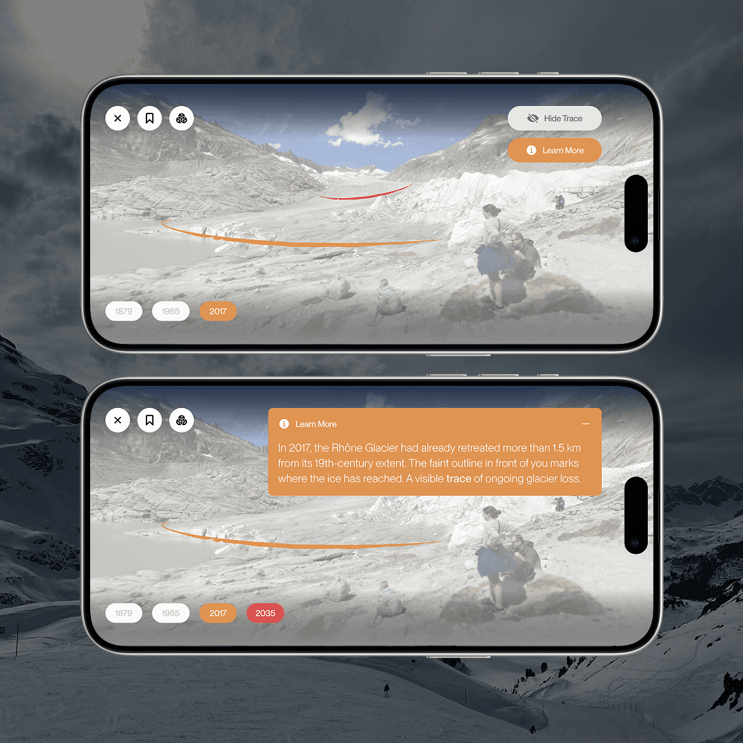 Using augmented reality, historical glacier ranges are projected onto the real landscape. The glaciers are not shown as reconstructed objects, but as transparent outlines. This visual reduction acts as a trace of loss, making absence visible rather than recreating what is gone.
